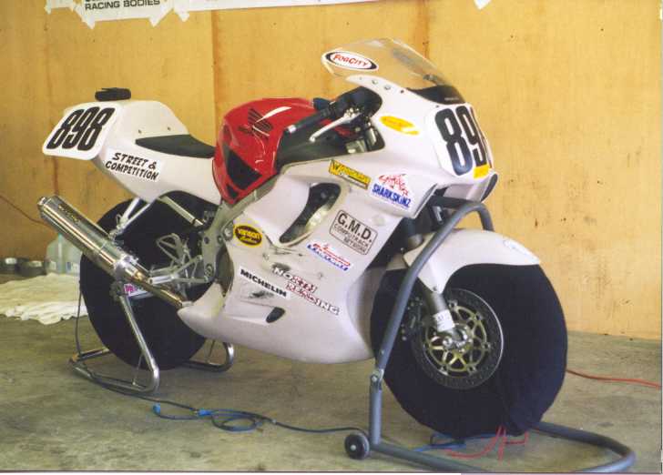 Paul's bike sits in the garage, tire warmers getting it ready for the next race.