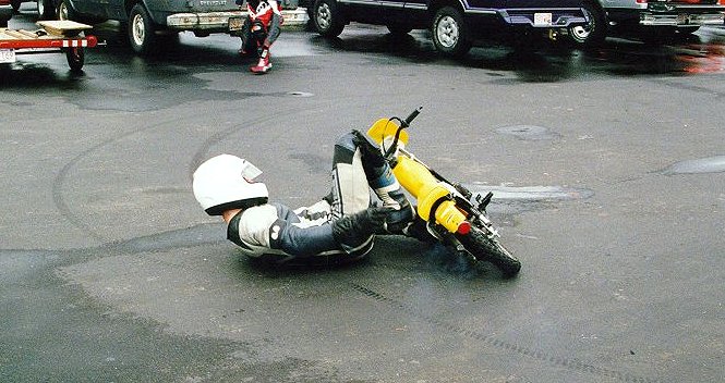 A shot of Patrick laying down black streaks on the poor pit bike, knee on the ground. Believe it or not, he's not crashing in this one. |