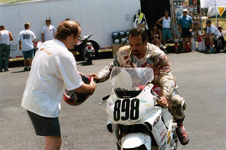 Reto takes Paul's helmet as he arrives back at the garage.