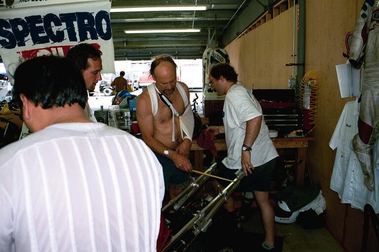 Todd (Scotts brother, with arm in sling from an oops on his 748 during practice) measures for a new subframe cross brace. Saturday, 600SS Qualifying |