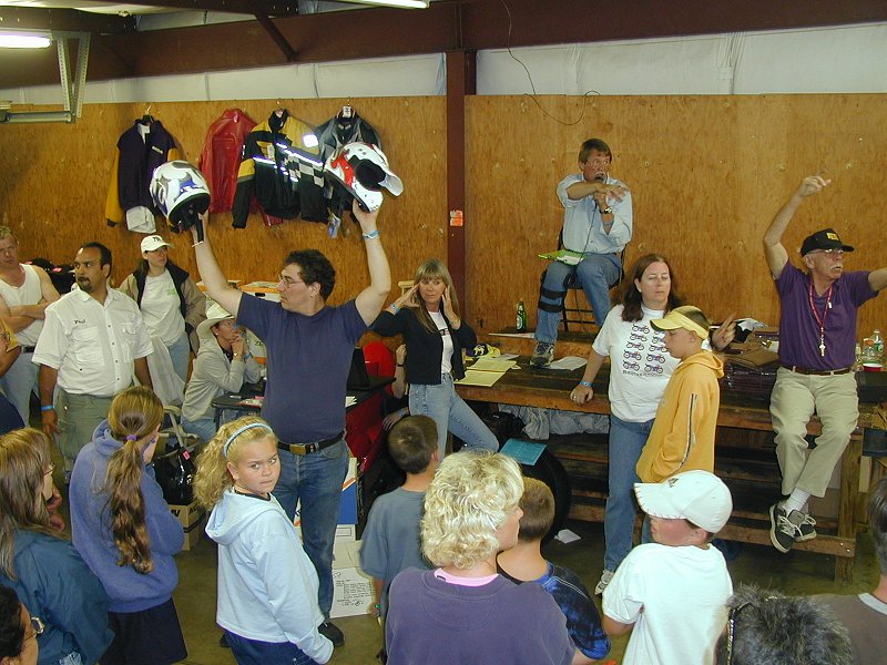 Kevin holds up the next two helmets, while Don points out a bidder.