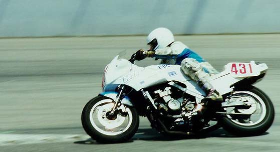 Paul and Kevin pose, with bikes, next to the Team Daemon Racing canopy